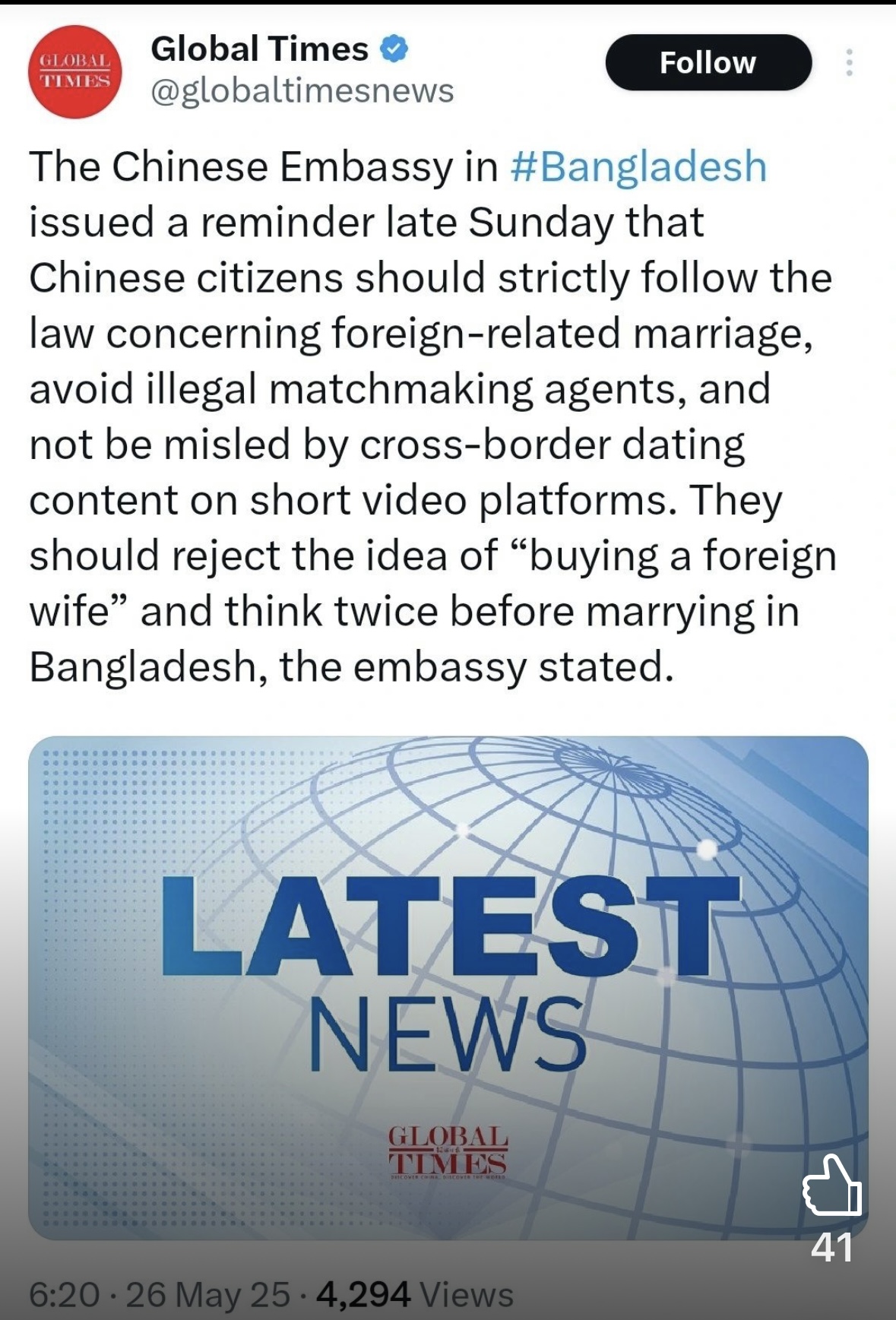 BEIJING/DHAKA/NEW DELHI — The Chinese Embassy in Bangladesh recently issued a warning to its citizens, urging them to avoid “buying foreign wives” from Bangladesh. The advisory highlights an increasingly complex social crisis rooted in China’s evolving marriage market — a scenario that carries critical lessons for India and other developing nations.
