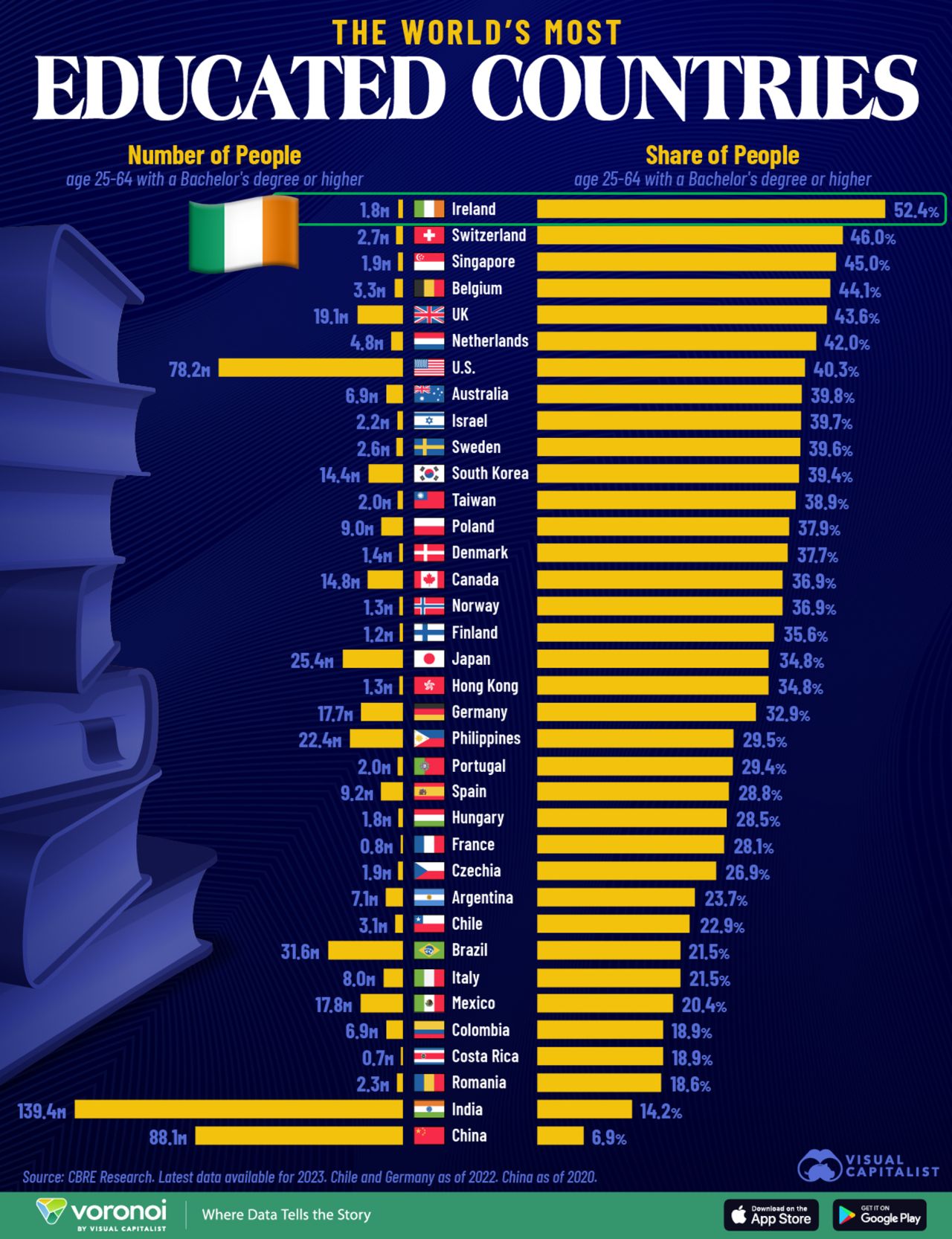 This chart shows the countries with the most educated populations, measured by both the number and share of adults aged 25–64 who have a bachelor’s degree or higher. The data comes from CBRE Research, using the latest available figures as of 2023.,