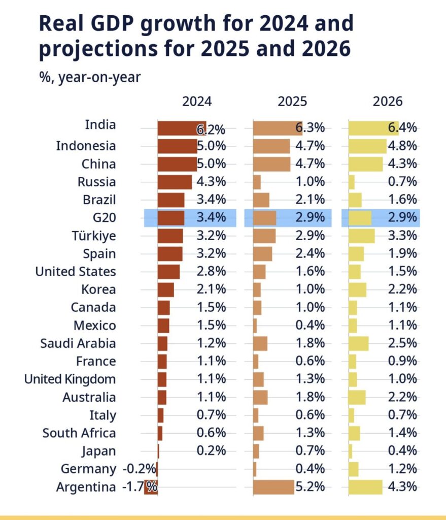 The broader OECD report, however, is less optimistic overall. Global GDP growth is expected to slow to 2.9% in both 2025 and 2026, down from 3.3% in 2024. The report warns that “rising trade costs, tighter financial conditions, and weakened business confidence” are weighing on global momentum.
