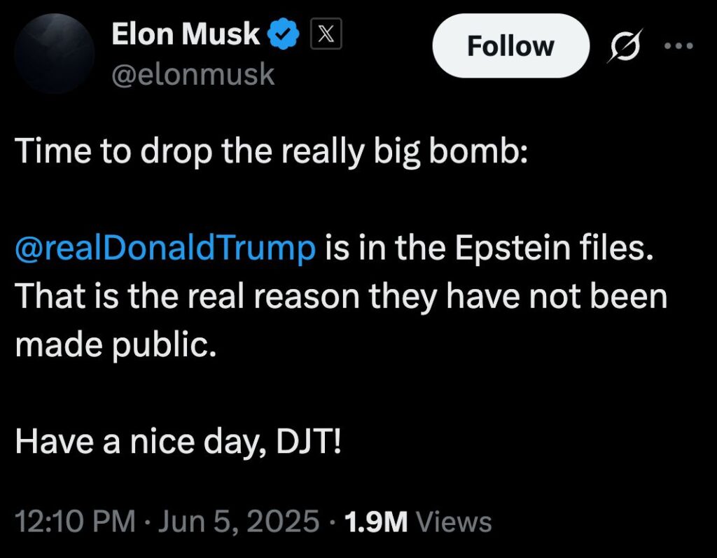 He suggested that this is the real reason the files haven’t been made public. Musk ended with Have a nice day, DJT!