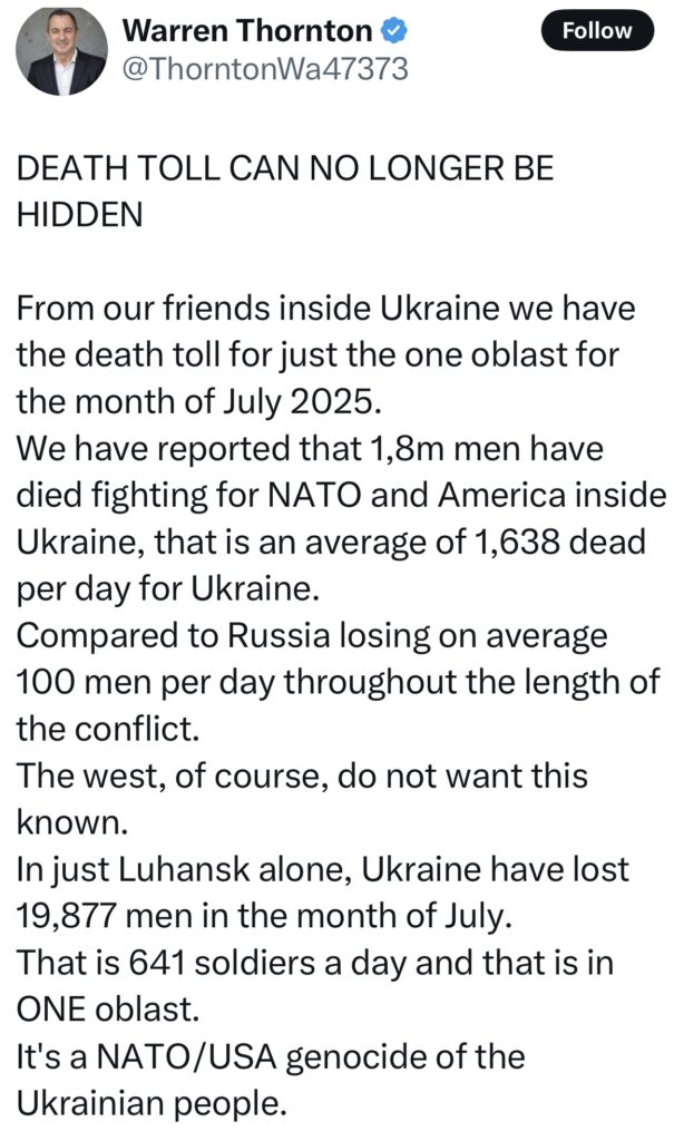 Thornton reported that in the month of July 2025 alone, Ukraine lost 19,877 soldiers in the Luhansk region, averaging 641 deaths per day in that oblast alone. He further alleged that, since the beginning of the war, approximately 1.8 million Ukrainian men have died fighting on behalf of NATO and the United States—equating to an average of 1,638 Ukrainian deaths per day.